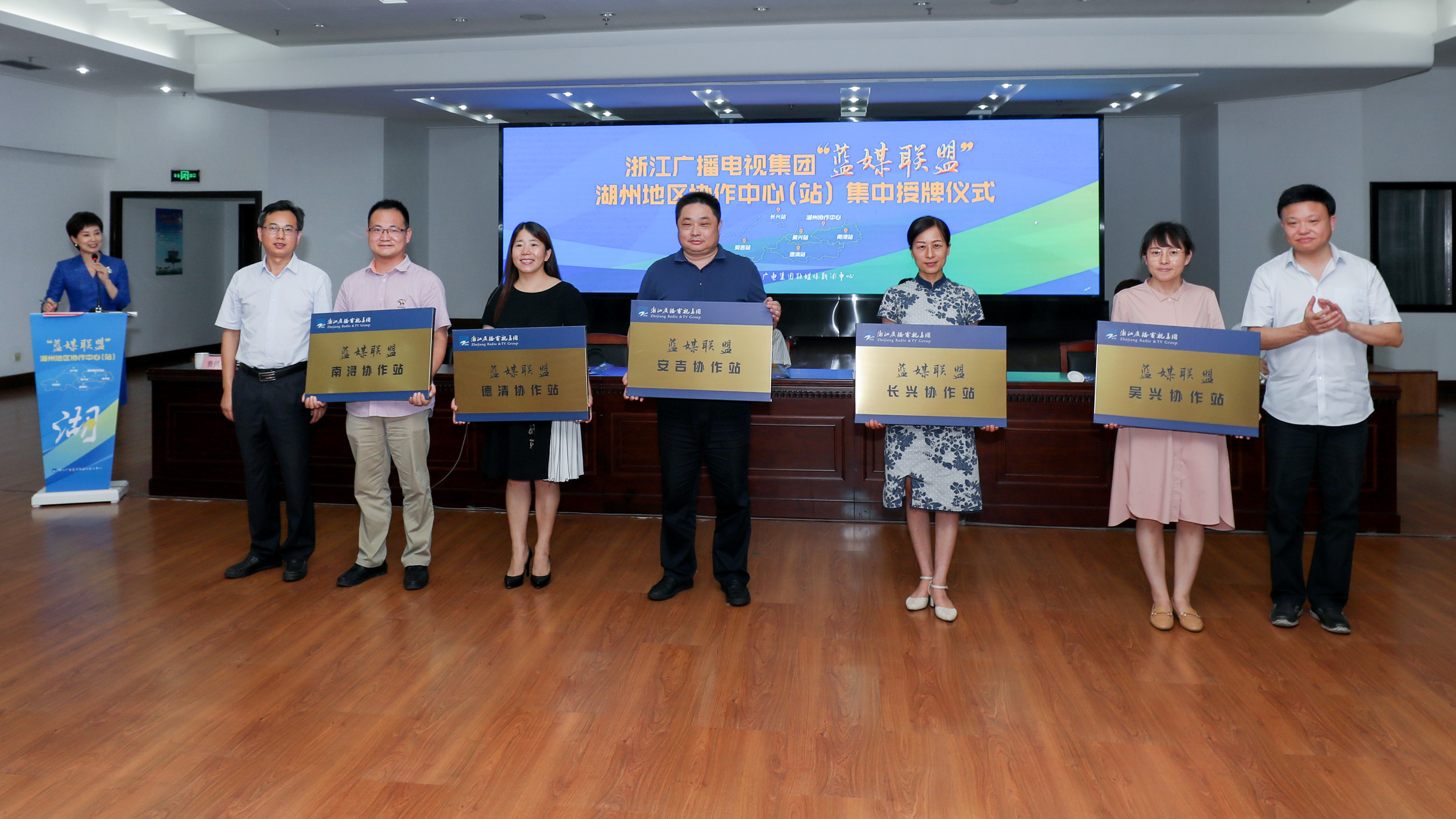 活动现场,浙江广播电视集团党委副书记、总编辑华宣飞,湖州市委常委、宣传部长范庆瑜给湖州市新闻传媒中心授牌“蓝媒联盟”湖州协作中心。浙江广播电视集团党委委员、副总编辑郭庆,湖州市委宣传部部务会议成员、市委网信办专职副主任曹佩中给吴兴区融媒体中心、南浔区融媒体中心、德清县新闻中心、长兴传媒集团、安吉新闻集团 5个县(区)融媒体中心授牌“蓝媒联盟”协作站。